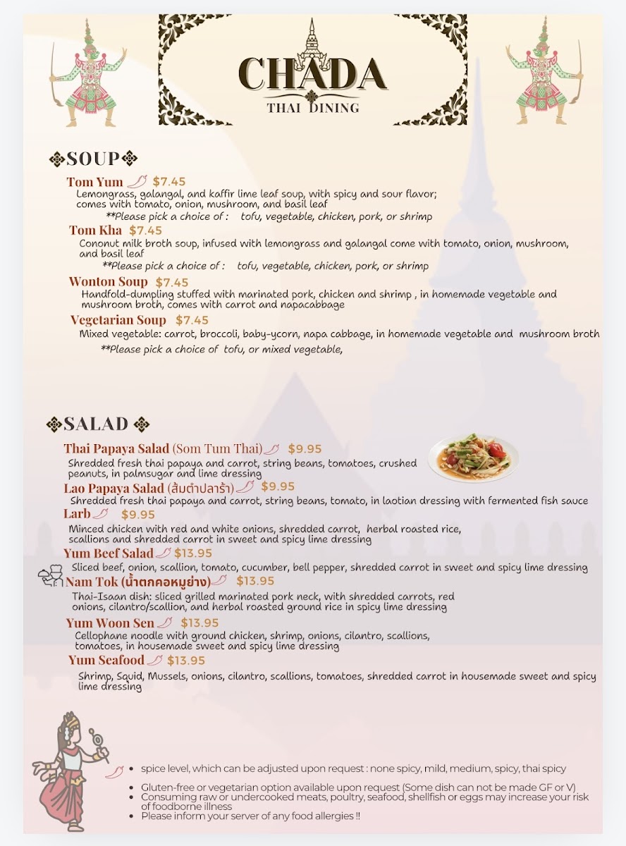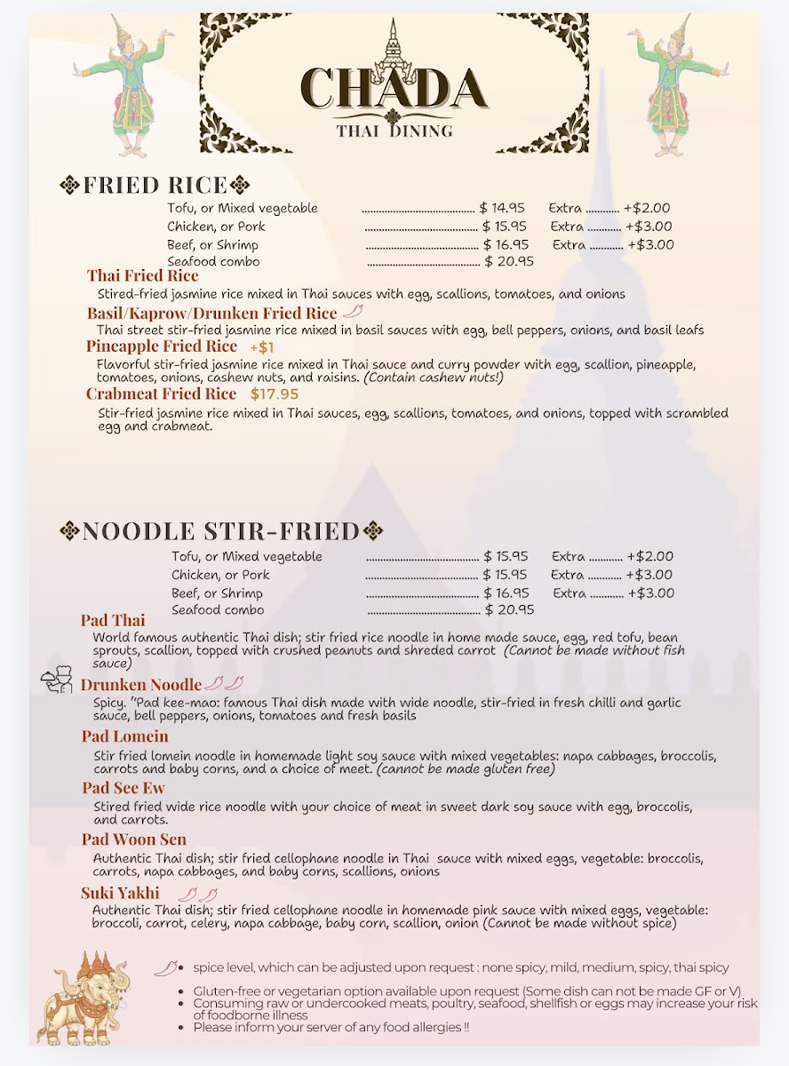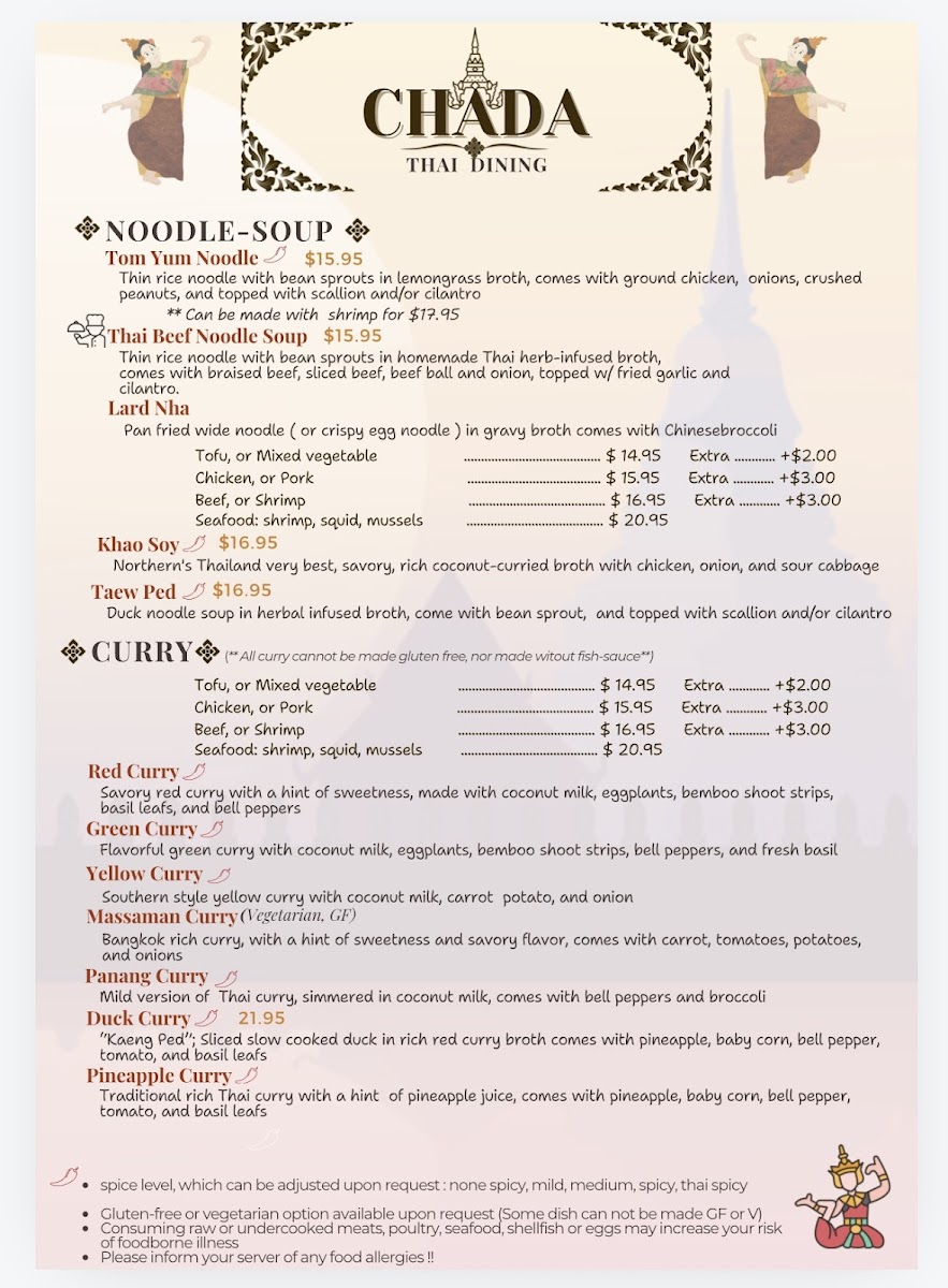 Customers appreciate the welcoming service from the Thai owners, enhancing the dining experience with their warm hospitality. The ambiance, adorned with charming local shops, adds to the allure, making it ideal for both dining in and takeout. Highly recommended by guests, Chada Thai Dining promises a memorable culinary voyage that delights the senses.