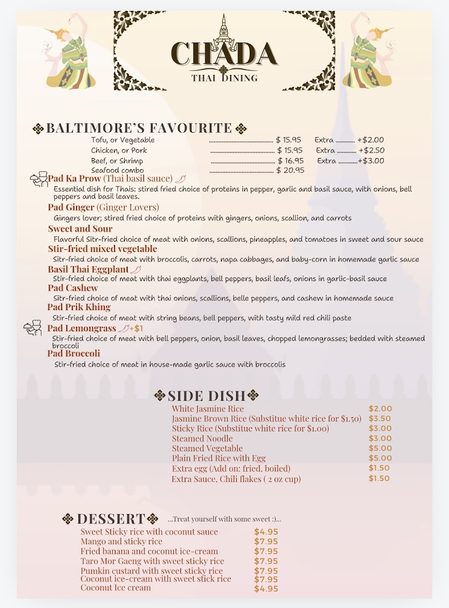 Welcome to Chada Thai Dining, a hidden gem located at 1019 Light St, Baltimore. This delightful Thai restaurant beckons food lovers with its authentic flavors and a cozy atmosphere. The menu features a range of tantalizing options, from Blanket Shrimp and Crispy Wontons as starters, to rich noodle soups like Khao Soy and Thai Beef Noodle Soup. Patrons rave about the generous portions and the unforgettable taste of dishes like the Pad Thai and Crispy Basil Chicken.